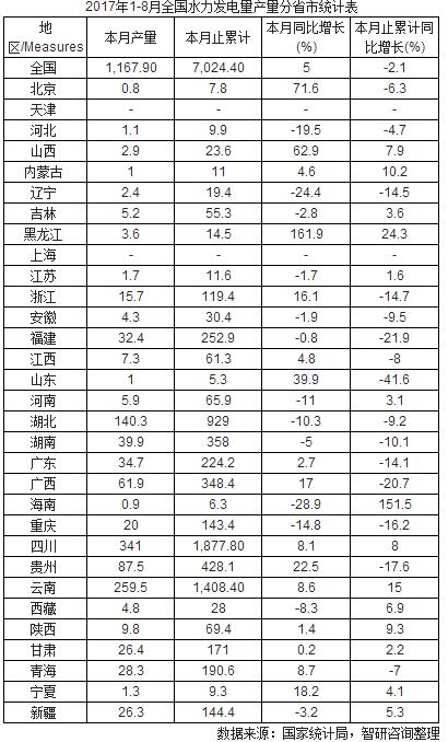 2017年1-8月全国水力发电量产量分省市统计表2017年8月中国水力发电量产量为1,167.90亿千瓦时,同比增长5%;2017年1-8月止累计中国水力发电量产量为7,024.40亿千瓦时,同比下降2.1%。
